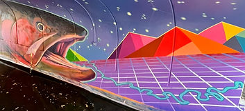 Chris Peterson designed the mural, seeking to incorporate all the interests of the partners into the concept. The focal point of the mural is the 75 foot Bear River cutthroat trout on the north wall. The trout is connected by a constellation night sky to the trial side of the mural, which features a spatial map of the Logan River drainage, including the path of the historic Little Logan River and a few of the many species found between the headwaters and the Great Salt Lake. White faced Ibis, Fire Flies, Monarch butterflies, and Old Ephraim are featured in the concept.