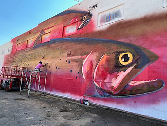 “The Colorado River cutthroat mural was painted in August 2023 during two sessions. I had the help of local painter Josh Simms on the first session, and SLC-based artists Caro Nilsson & Tiffany Rainwater came up to help me on the details. We put the clear coat on the wall just as the Dinah Soar days festivities were kicking off. What an awesome public event that was! With the balloons, the community participation and the education by Utah DWR, this celebration of these native fish was special." -chris peterson